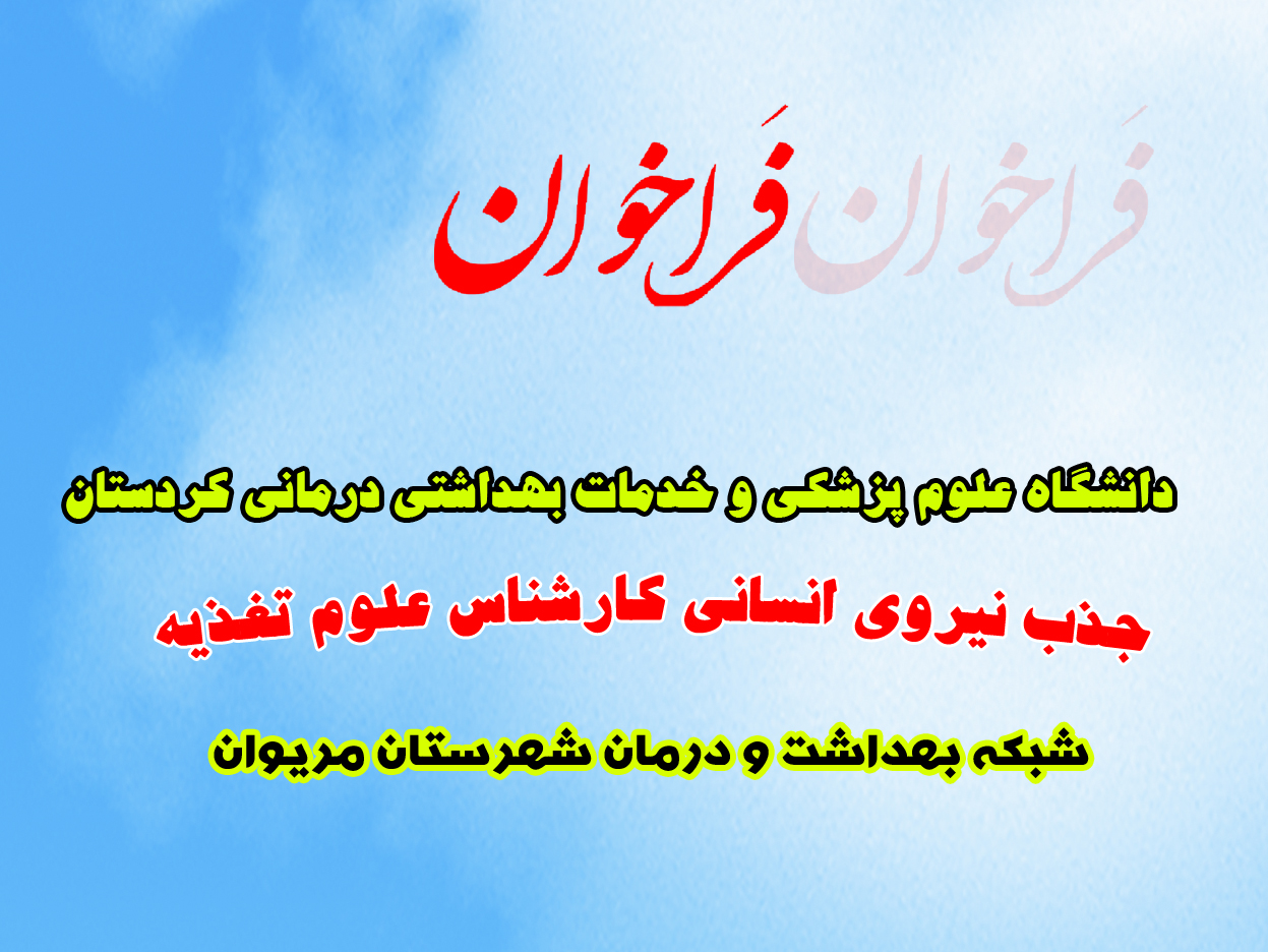 دانشگاه علوم پزشکی و خدمات بهداشتی درمانی کردستان در نظر دارد جهت تامین نیروهای مورد نیاز در شبکه بهداشت و درمان شهرستان مریوان به استناد ماده 5 نسخه 23 دستورالعمل اجرایی برنامه بیمه روستایی و پزشکی خانواده ، نسبت به جذب یک نفر نیروی انسانی "کارشناس علوم تغذیه" پس از انجام مصاحبه و تایید گزینش اقدام نماید.