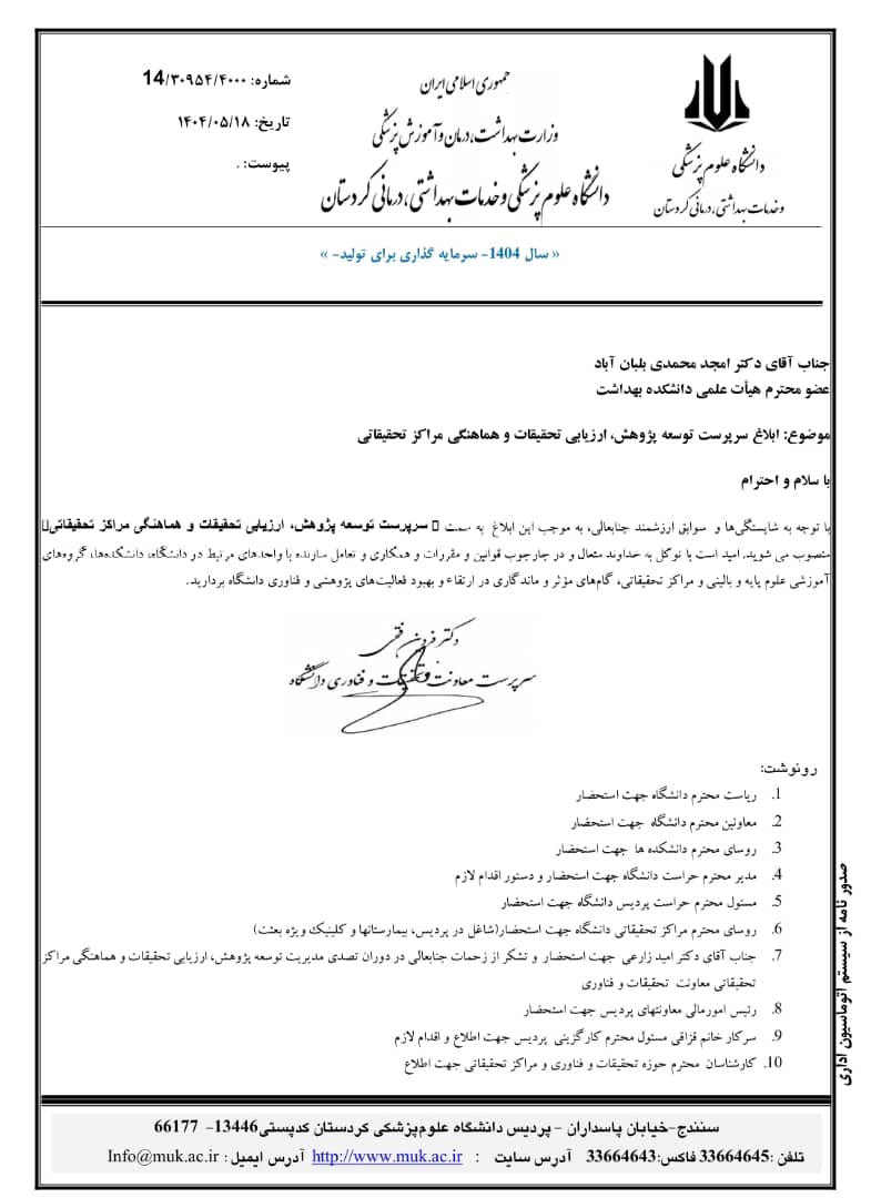 جناب آقای دکتر فردین فتحی معاون تحقیقات و فناوری دانشگاه با صدور ابلاغی آقای دکتر امجد محمدی را به عنوان سرپرست توسعە پژوهش، ارزیابی تحقیقات و هماهنگی مراکز تحقیقاتی منصوب کرد.