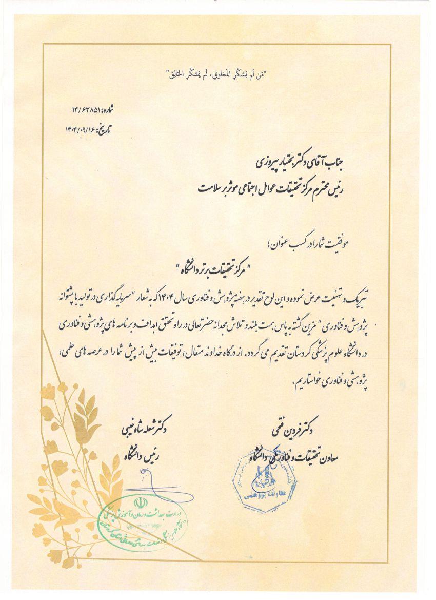 در آیین تقدیر از پژوهشگران و فناوران برتر پژوهش و فناوری سال 1404که با حضور جمعی از مسئولان، استادان و پژوهشگران برجسته دانشگاه علوم پزشکی کردستان در سالن ابن سینا برگزار گردید، مرکز تحقیقات عوامل اجتماعی مؤثر بر سلامت (SDH) موفق شد عنوان ارزشمند «مرکز تحقیقاتی برتر دانشگاه» را به دست آورد. کسب این عنوان، حاصل تلاشهای مستمر، برنامهریزی دقیق و همت والای اعضای هیئت علمی، پژوهشگران و مدیران مرکز است که با رویکردی علمی و مبتنی بر نیازهای جامعه، توانستهاند دستاوردهای قابل توجهی در حوزه سلامت اجتماعی ارائه دهند.